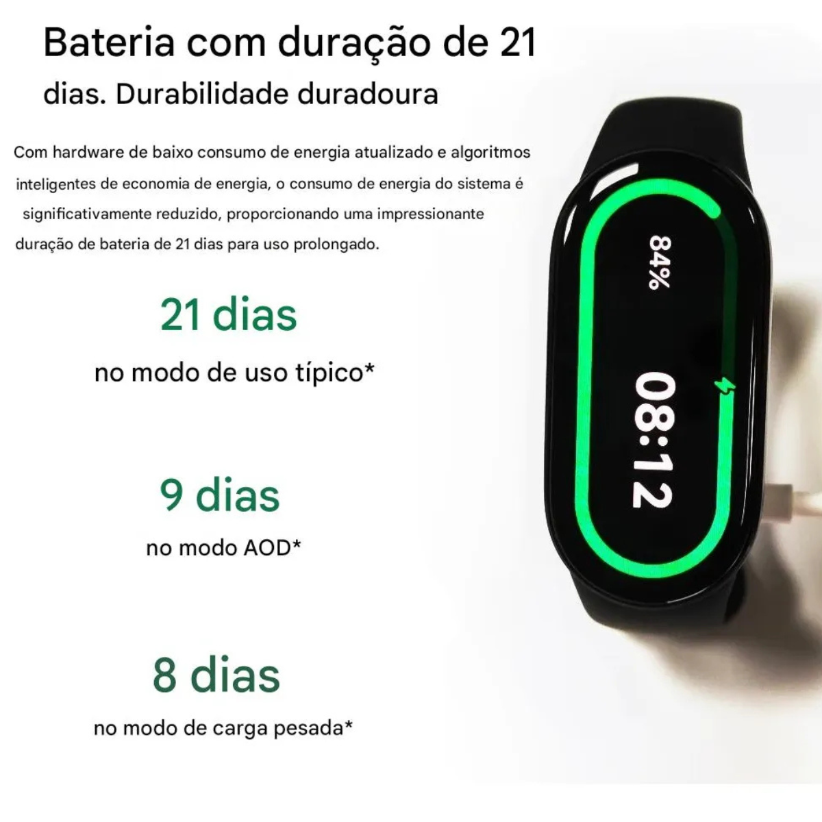 Bateria: 233 mAh, com carregamento magnético, autonomia de até 21 dias.